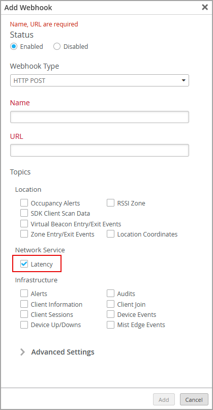 You can now subscribe to the client latency webhook to receive DHCP, DNS, and authentication latency information for the client devices at the site level. If you subscribe to this webhook, you will receive the site average, minimum, and maximum latency data in milliseconds for a 10-minute window at 10-minute intervals. To be able to use the Client Latency webhook, you need an active Marvis subscription. To configure the client latency webhook, select the Latency webhook topic on the Add Webhook window on the site configuration page (Organization > Site Configuration).