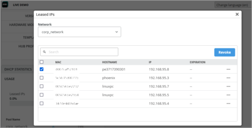 You can now view and revoke the DHCP lease on WAN Edge devices. The revoke option lets you release client devices from their current lease. To view the DHCP lease information, go to the Leased IPs window by clicking the hyperlinked values in the Leased IPs column in the DHCP Statistics section on the WAN Edge details page. The Leased IPs window displays the client devices (MAC Addresses or hostnames) along with the leased IP addresses and the lease expiry dates. On the Leased IP window, select a DHCP lease record and click the Revoke button to revoke the DHCP lease.