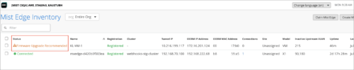 The Mist Edge Inventory page now displays a firmware upgrade recommendation message for the Mist Edges that are running outdated firmware versions. The message that reads ‘Firmware Upgrade Recommended’ is displayed in the Status column of the Mist Edge Inventory page if a new Tunterm service version is available for upgrade. You can see the same status message on the Mist Edge details page as well.