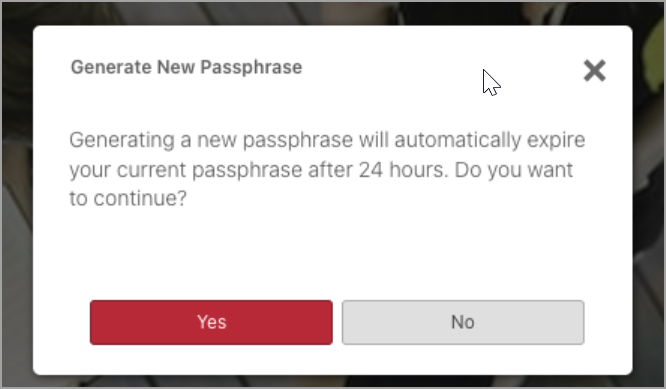 In the PSK portal, when you click the Generate New Passphrase button, you will get a confirmation window with a message indicating that generating a new passphrase causes your current passphrase to expire after 24 hours. On the confirmation window, you need to click Yes to proceed. Previously, clicking the Generate New Passphrase button used to generate the passphrase without a confirmatory message.