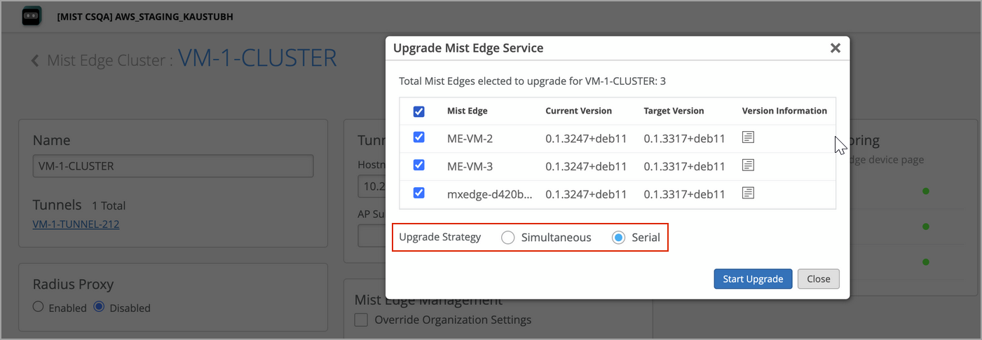 Serial: This option upgrades the Mist Edges one by one, one after another. The serial upgrade is the lowest impact option. APs are gracefully moved to another Mist Edge before the upgrade.