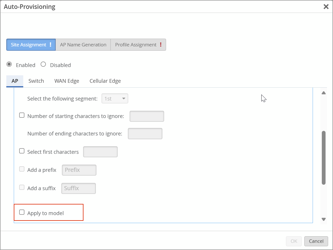 Site Assignment workflow: You can use AP Model as a parameter in determining the site to which an AP should be assigned. This parameter is available when you select LLDP System Name or DNS Suffix as the source for deriving the site from. This option is already available for the source AP Name.