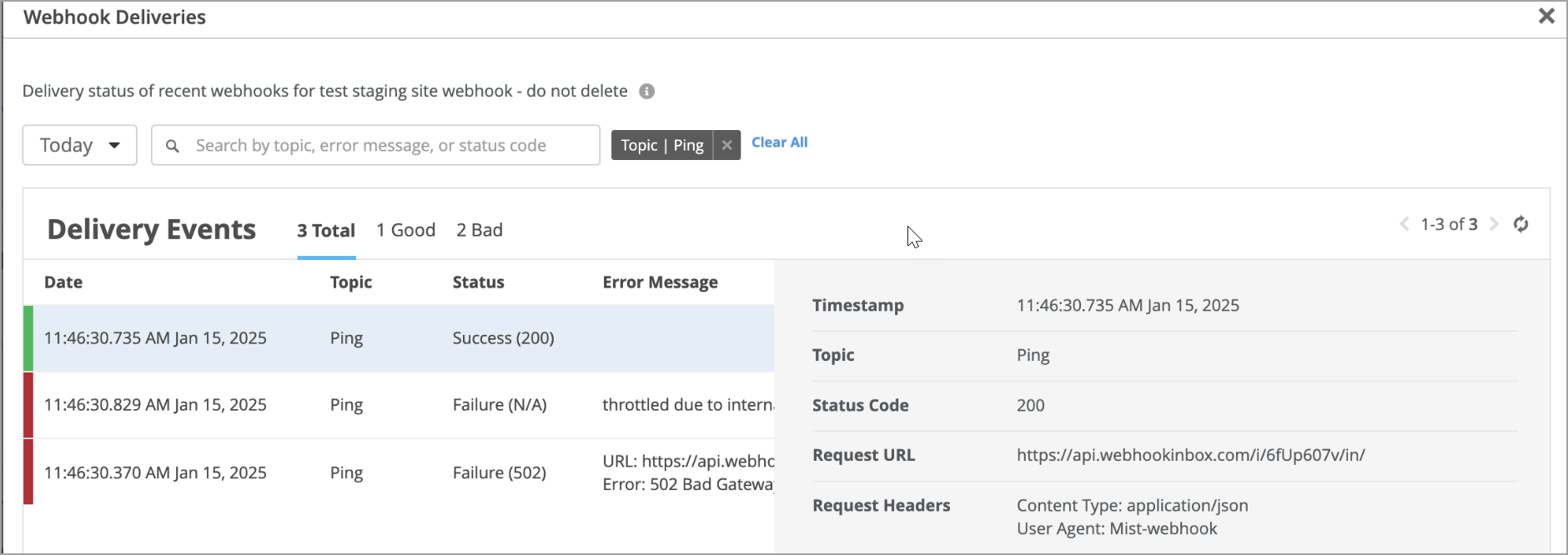 To view the status, click the View hyperlink in the Deliveries column on the Webhook tile, and you will be taken to the Webhook Deliveries page. This page displays webhook delivery status (Success or Failure) along with status code and other details. For each failed delivery, the page displays an error message containing additional insights into the failure.