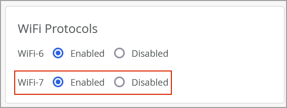 You can enable or disable Wi-Fi 7 per WLAN from the WLAN configuration page. This option applies to Access Points that support Wi-Fi 7 and has no impact on APs that do not support Wi-Fi 7.