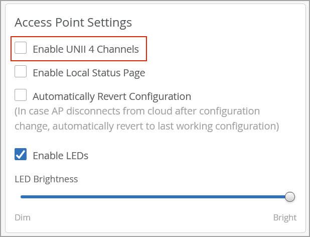 You can enable or disable the UNII 4 channels from the Access Point Settings section on the site configuration page (Organization > Site Configuration).