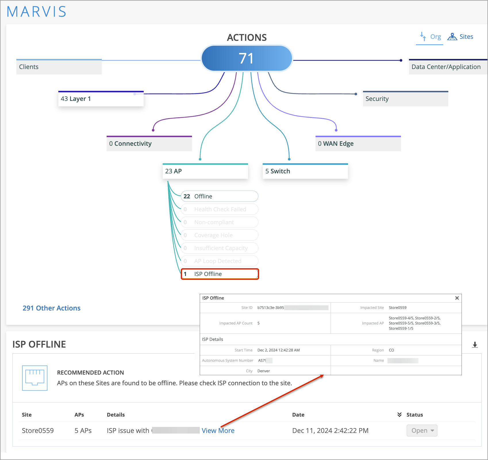 We have added a new Marvis Action, named ISP Offline, to Mist. This action detects access points (APs) that are offline because of ISP-related issues, such as ISP regional outages, routing issues, DNS issues, or issues caused by incorrect network settings. Marvis can determine whether the issue is limited to APs in a specific site or spread across multiple sites. It can also pinpoint the ISPs through which the impacted APs were connected, making the troubleshooting process easier.