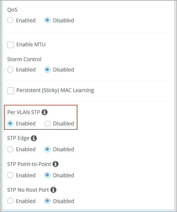 You can configure a switch with VLAN Spanning Tree Protocol (VSTP) or per-VLAN Spanning Tree. This configuration is available in port profiles in the organization and site templates and on the switch details page. VSTP helps in preventing loops in Layer 2 networks on a per-VLAN basis. One Spanning Tree per VLAN enables fine grain load balancing. We recommend enabling this feature for other vendor’s devices (for example, Cisco) that operate per-VLAN spanning tree by default. When VSTP is enabled on a port, RSTP is automatically disabled on that port.