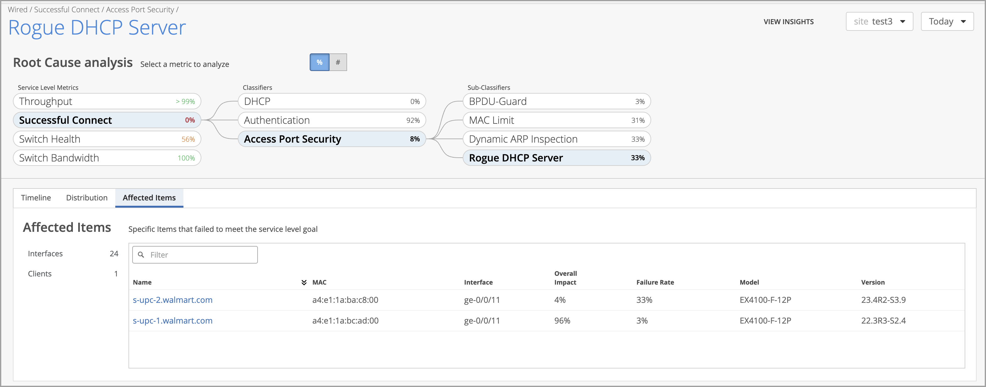 We have added a new classifier, named Access Port Security, to the Successful Connect SLE for switches. This classifier helps you identify client connection failures caused by access port security issues. This classifier groups the reasons for connection failures into the following sub-classifiers: