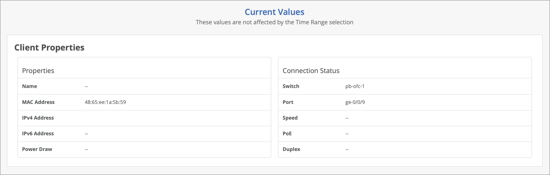 Mist can now retrieve and display the client properties and connection status data for the wired clients that are disconnected from the switch. This information, displayed in the Client Properties section on the clients Insights page, includes the client MAC address, switch name, and the switch port to which the client was previously connected. This enhancement allows you to access historical connection data, helping in troubleshooting and network management even when clients are not connected to the switch. Previously, the client properties and connection status data were available for clients only when they were connected to the switch.
