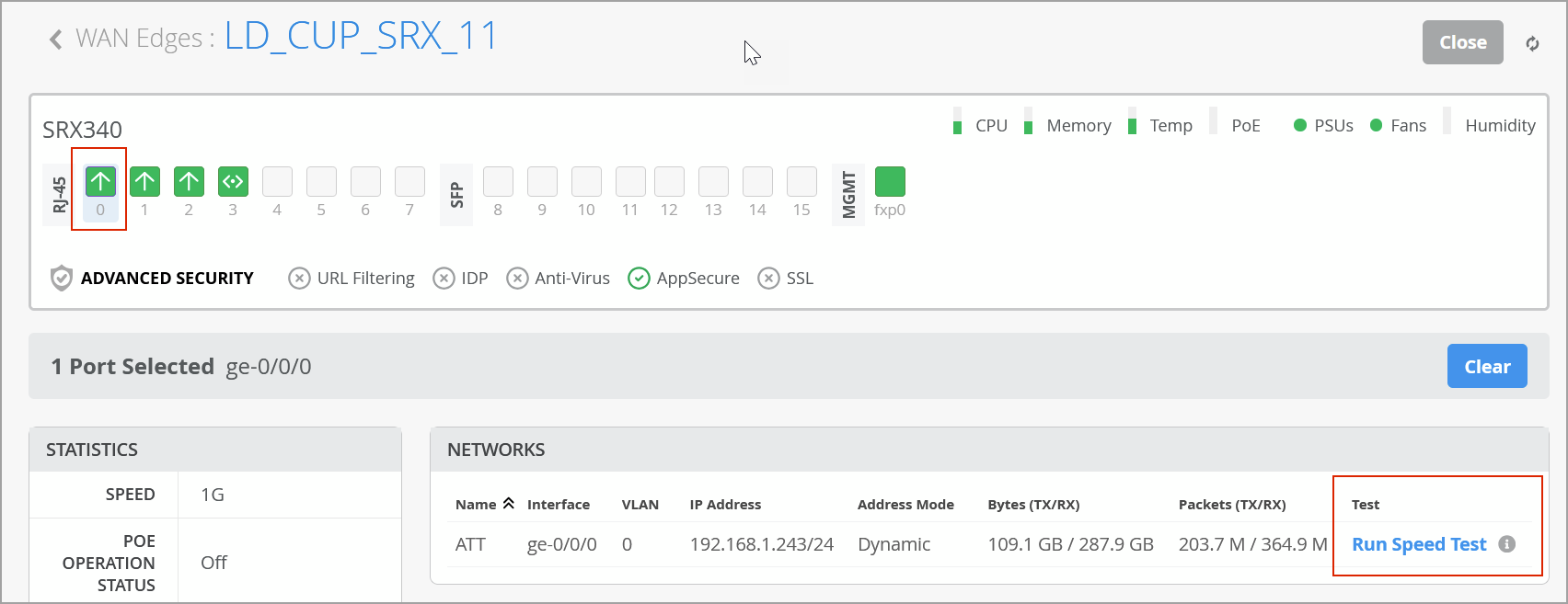 To run a speed test, navigate to the SRX WAN edge details page (WAN Edges > WAN Edges > WAN Edge Name), select the WAN port from the port panel, and then click the Run Speed Test link in the Networks section.