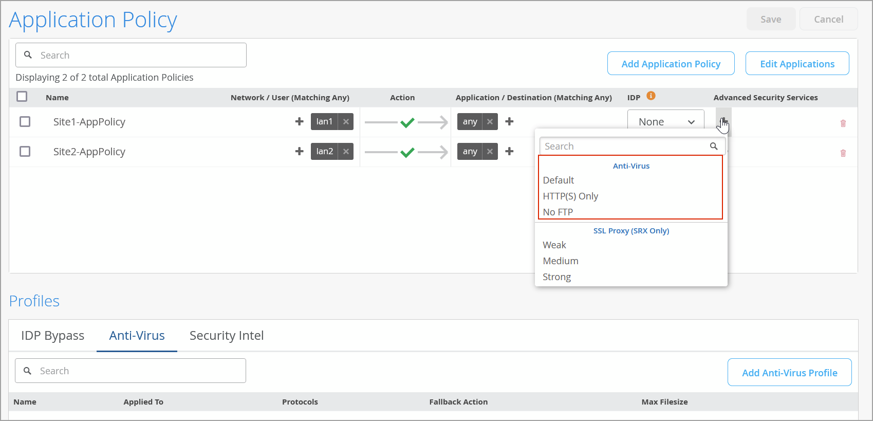 You can apply an anti-virus configuration to application policies under Advanced Security Services for WAN edge devices. Antivirus is part of our secure AI native WAN edge feature set, which includes, in addition, IDS/IPS (IDP), URL Filtering, and SSL proxy. You can either select an anti-virus configuration from a set of predefined values (Default, HTTP(S) Only, and No FTP), or create a custom anti-virus configuration. To apply an anti-virus configuration to an application policy, click the + button in the Advanced Security Services column on the Application Policy page (Organization > WAN > Application Policy). To create a custom anti-virus configuration, use the Add Anti-Virus Profile button. You can also view the security events against the anti-virus configured from the Site > Security Events > Anti-Virus page.