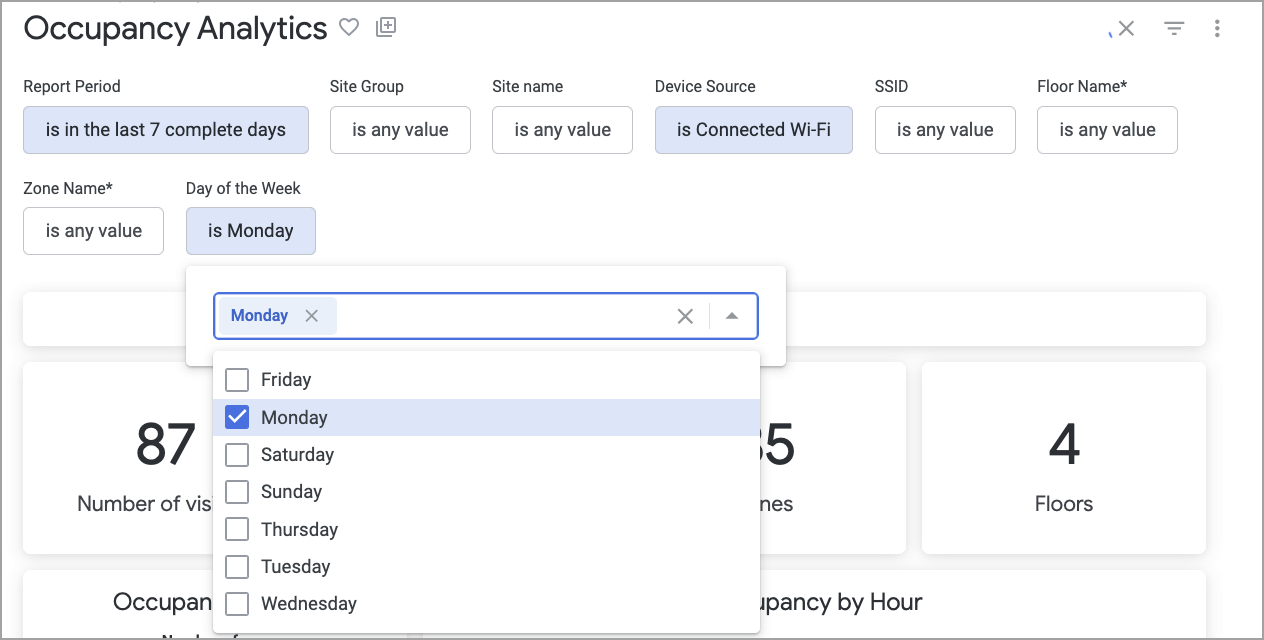 Weekday Filters: Analyze occupancy trends for specific weekdays or working days to optimize scheduling and resource allocation.