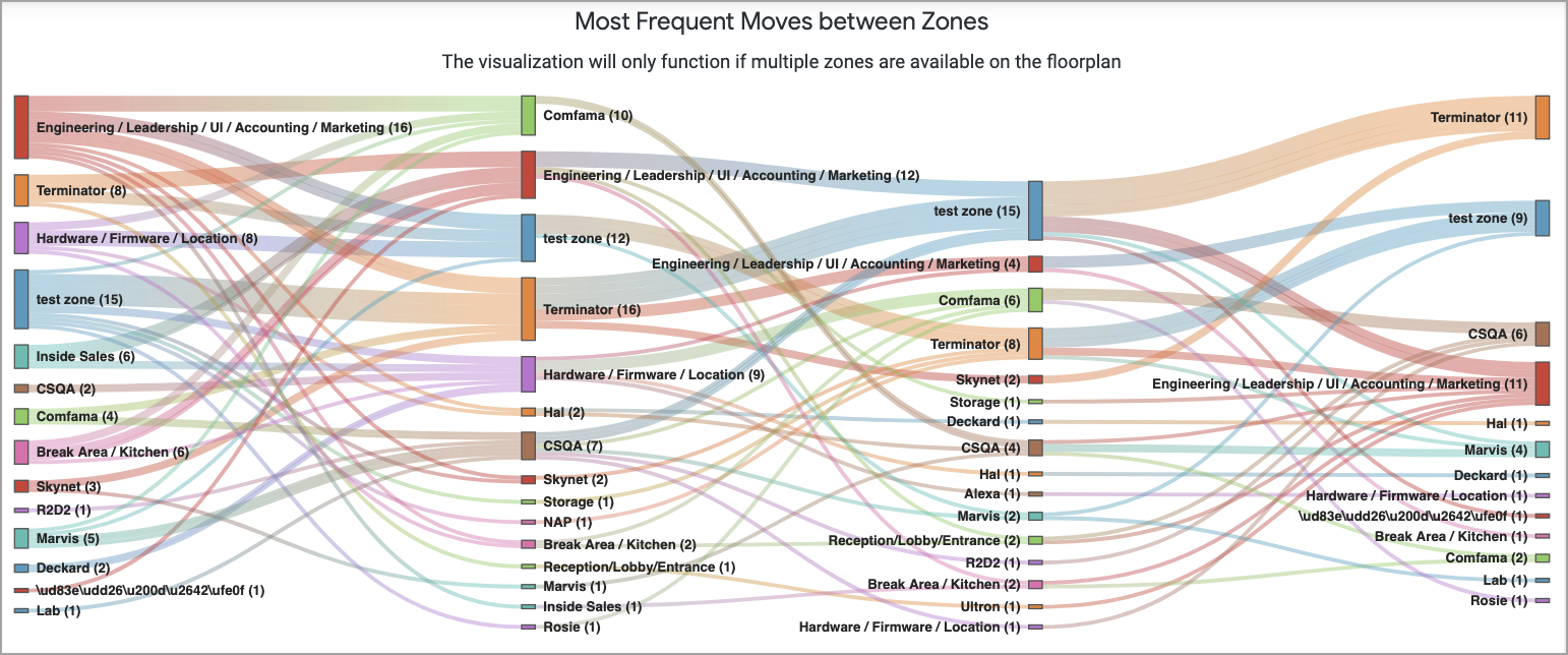 Frequent Movement Tracking: Monitor transitions between zones and floors to enhance space planning and employee flow management.
