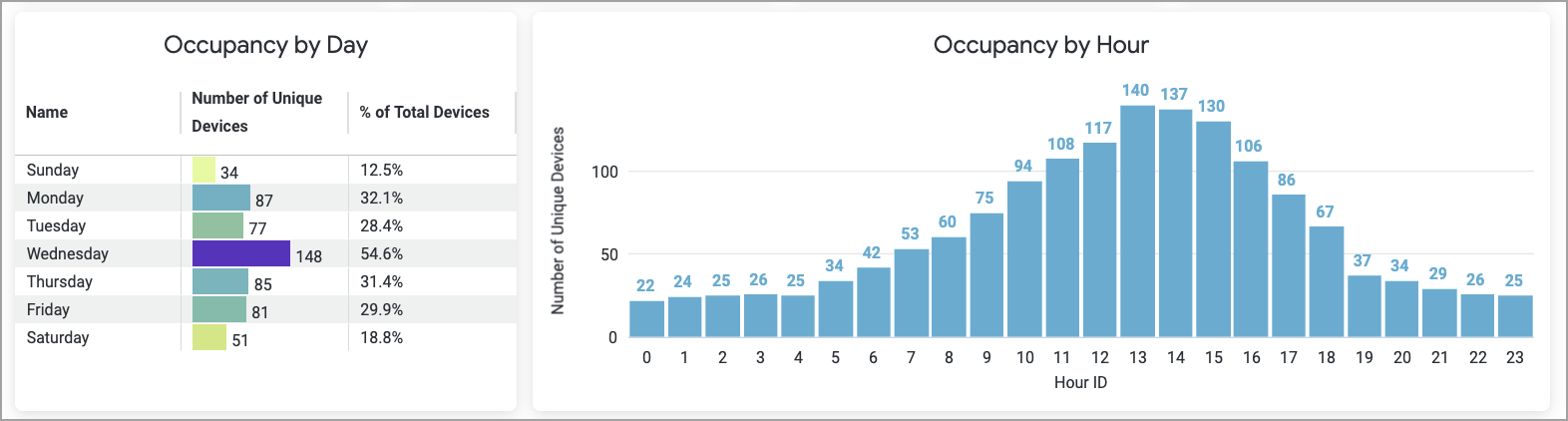 Time-Based Occupancy Insights: Understand peak usage hours by monitoring the occupancy trends by day of the week and hour of the day.