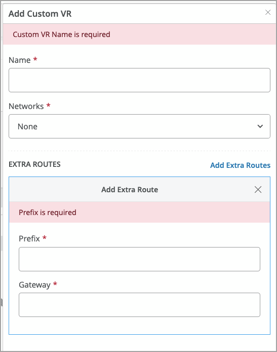 To configure static routes, use the Add Extra Routes button on the Add Custom VR window, accessed from the LAN section of the WAN edge configuration page (or template).