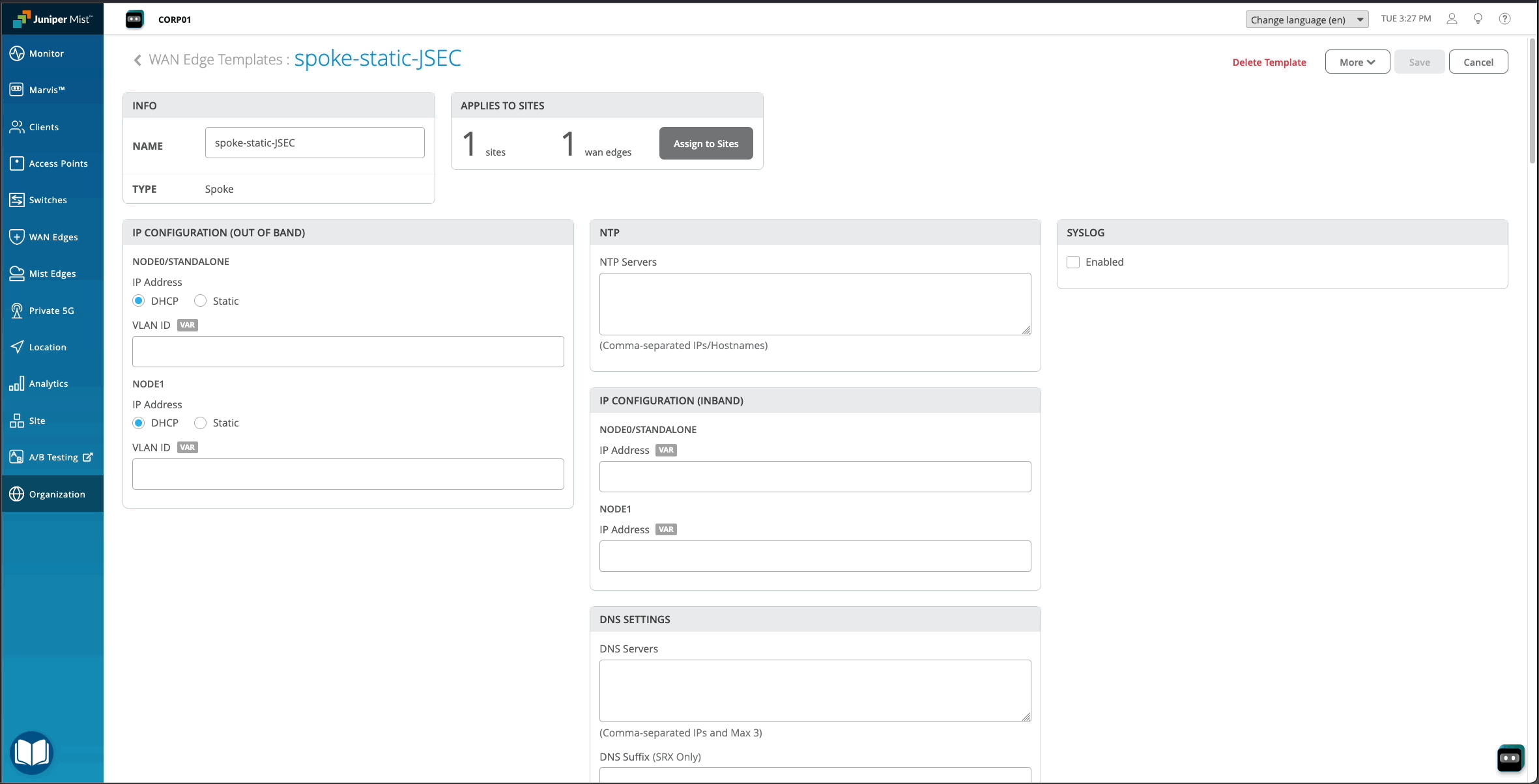 You can configure static routes in virtual routers (custom VRs) at the organization level templates, site level templates, or at the device level configurations for SRX series firewalls. Previously, Mist supported only OSPF and BGP routes in custom VRs. Static routing is preferred when the complexity of a dynamic routing protocol is not desired.