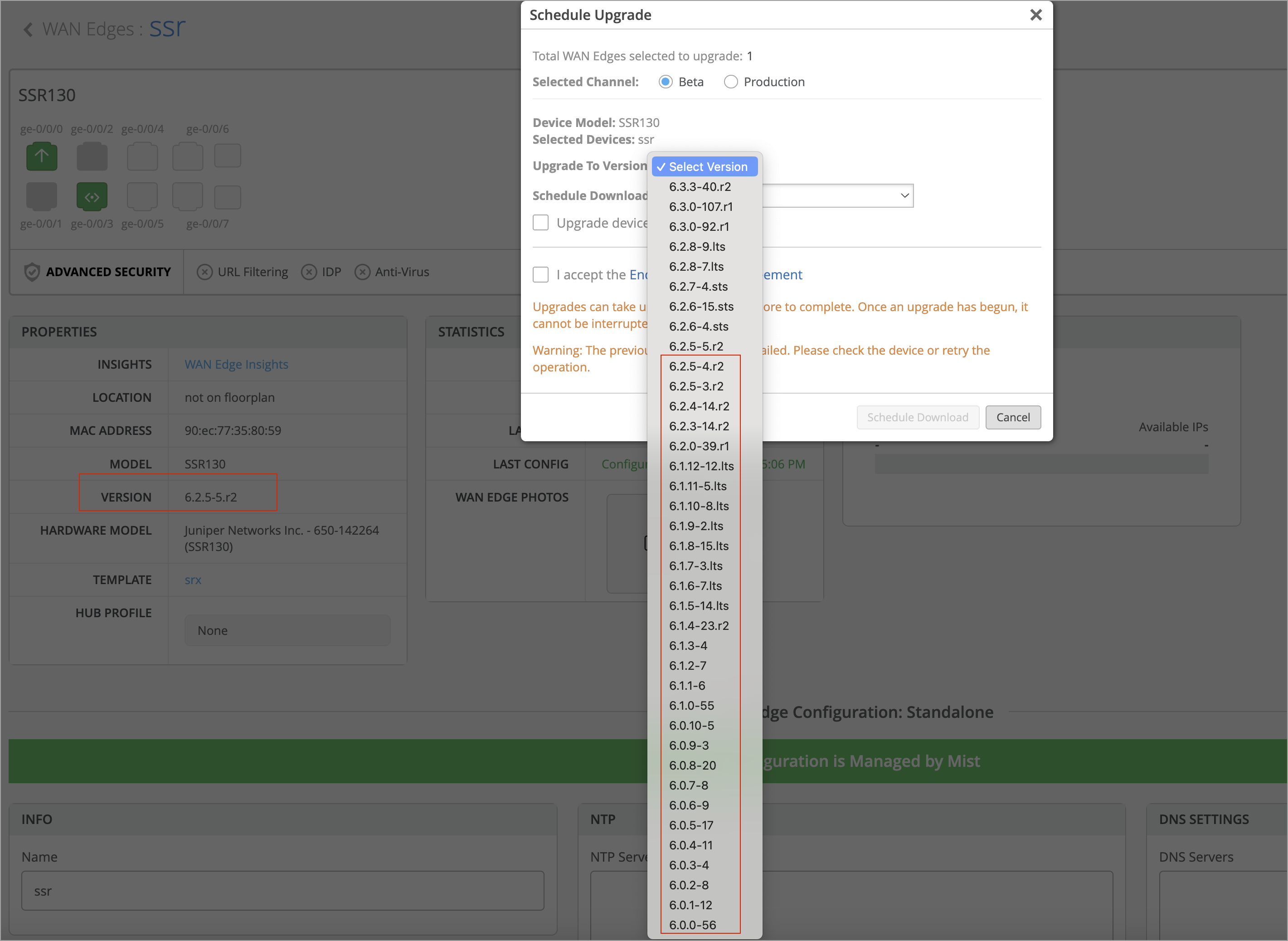 You can now downgrade the firmware version running on an SSR. You can do this by selecting a lower version of the firmware from the Upgrade Firmware page, accessed from the Utilities menu on the WAN edge details page.