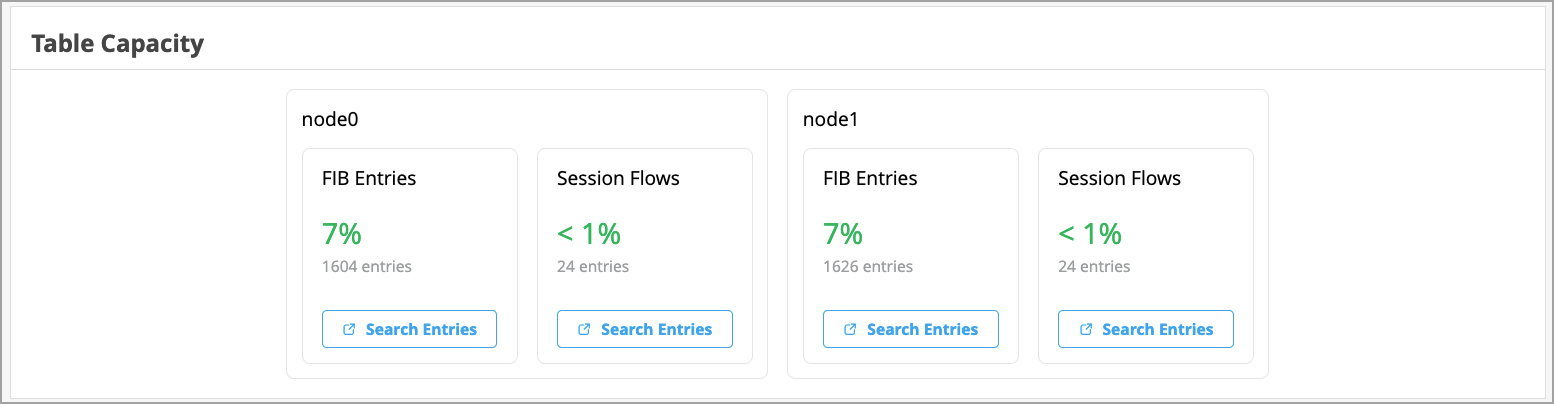 You can also click the Search Entries button under each metric to open a shell view in a new window where you can search for entries after specifying filters. In the case of a high availability cluster, Table Capacity indicators are displayed for each node.