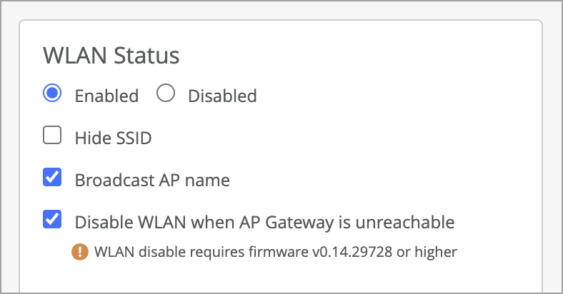 These are per-WLAN configurations. To disable a WLAN when the AP’s default gateway is unreachable, such as when the AP has no IP address or no default gateway, select the Disable WLAN when AP Gateway is unreachable checkbox in the WLAN Status section on the WLAN configuration page.