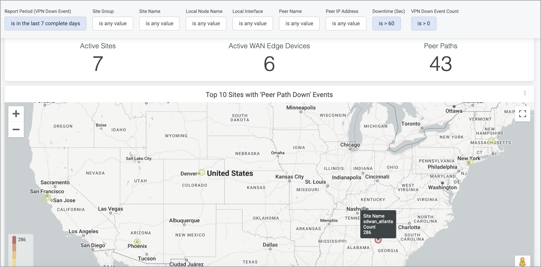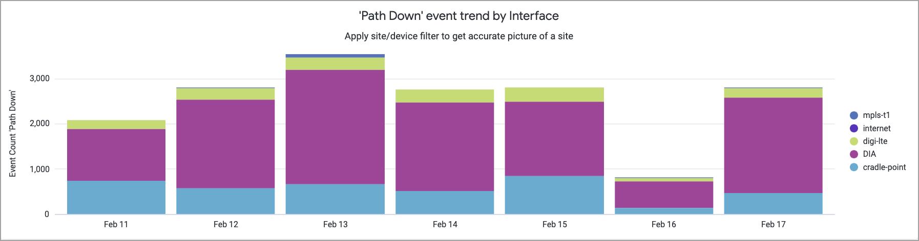 We have added a new Premium Analytics dashboard, Peer-Path Insights, to Mist to give you a consolidated view of organization-wide peer paths and their path down events, such as the top sites and top peer paths encountering path down events. A peer path in the context of Juniper Mist WAN Assurance refers to the connections between session smart WAN edge devices over a WAN network, chosen for redundancy and optimal performance. In a large-scale deployment, this dashboard helps in identifying the most problematic sites, peer paths, and timeline of fluctuations.