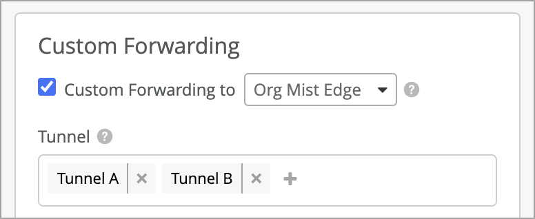 You can select multiple tunnels when you set custom forwarding to Org Mist Edge (previously called 'Mist') from the WLAN configuration page. You must ensure that a VLAN is not duplicated on multiple tunnels. To select multiple tunnels for custom forwarding, click the + button under the tunnel field to add one or multiple tunnels.