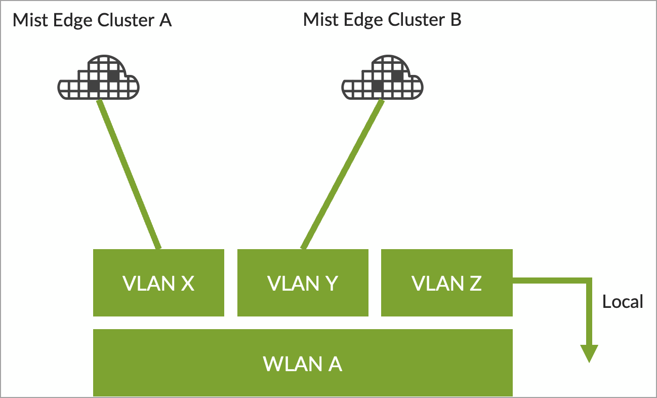 A single WLAN can now forward to multiple Mist Edge tunnels, as well as local breakout. Within a WLAN you can decide the forwarding behavior by VLAN. The intended use for the per VLAN forwarding control is to enable extremely high scalability in large environments since the AP can forward to different Mist Edge clusters. Another use is SSID consolidation with flexible forwarding.