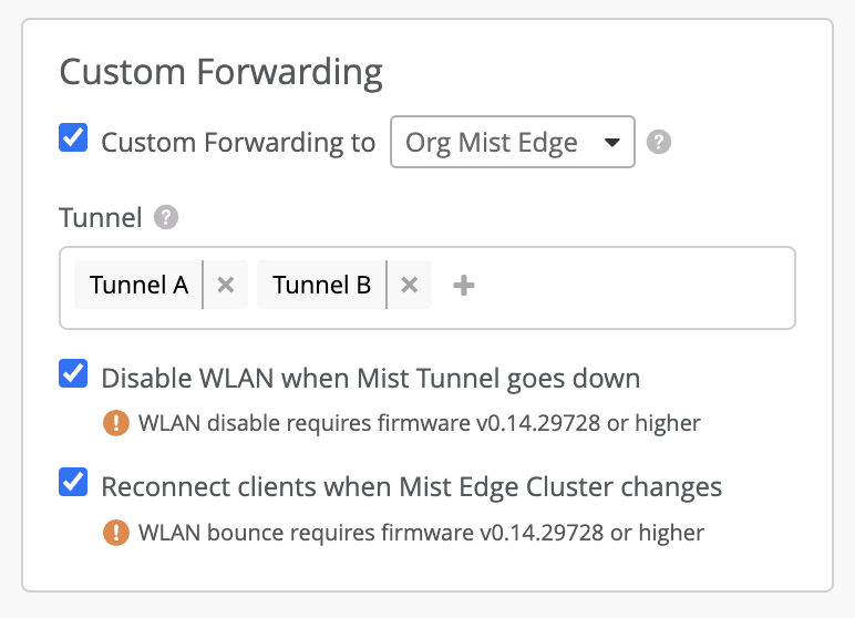 To disable the WLAN when the Mist Edge tunnel is down, check that option in the Custom Forwarding section on the WLAN configuration page. Similarly, to force clients to reconnect when the AP’s Mist Edge tunnel fails over to a Mist Edge in a different Mist Edge cluster, select the corresponding checkbox.