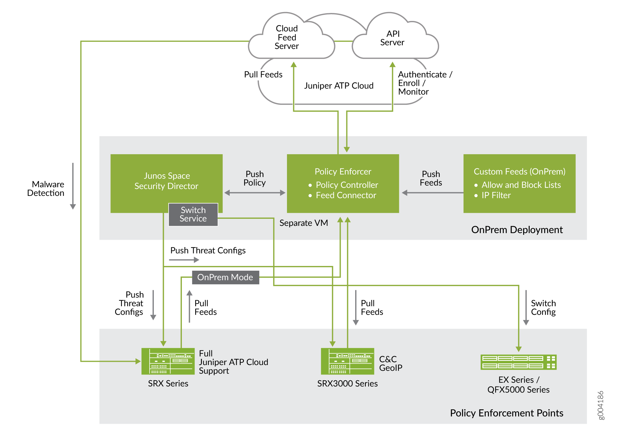 Feed Connector—Aggregates the cloud and customer feeds and is the server for SRX Series devices to download feeds.