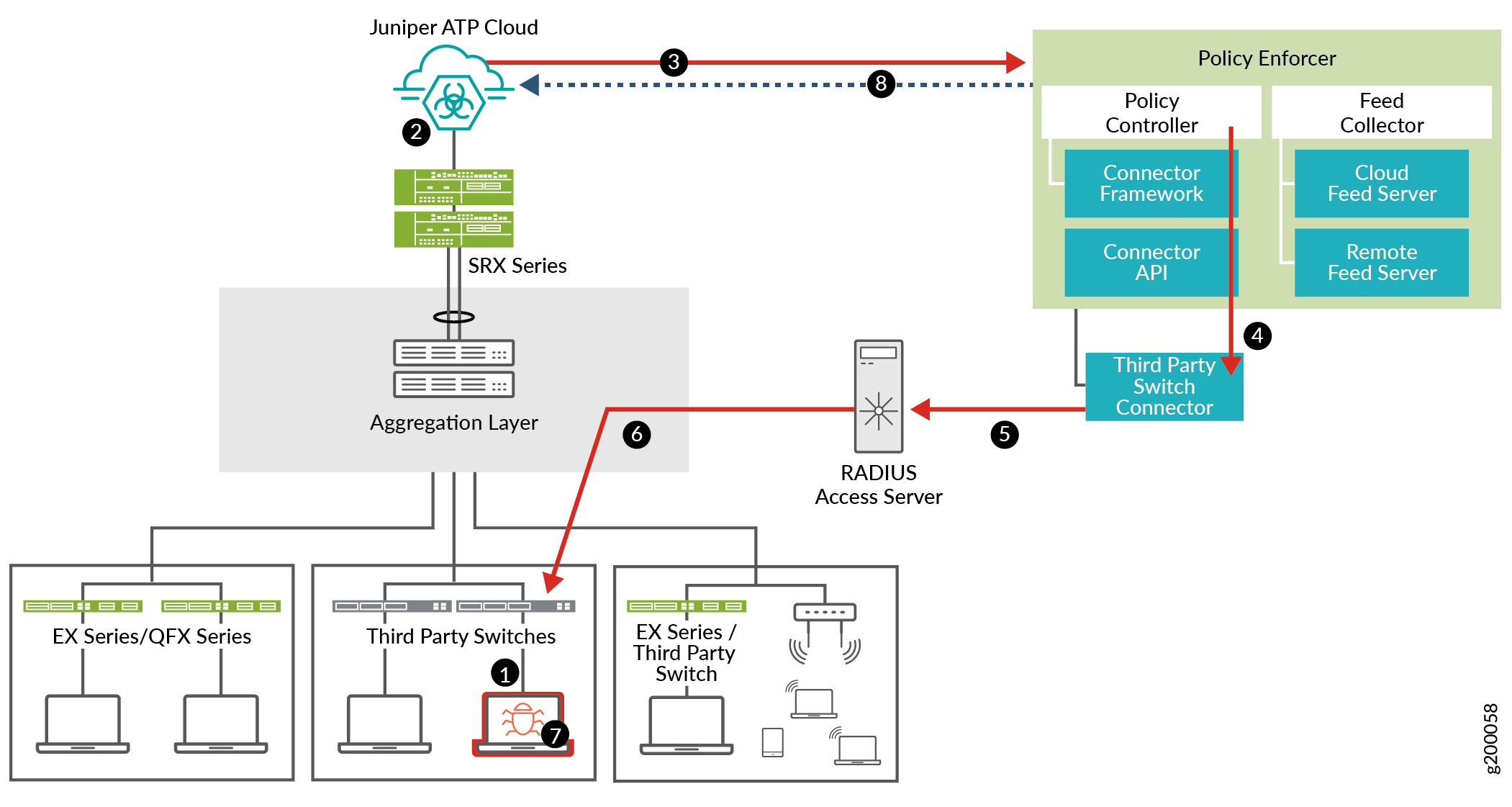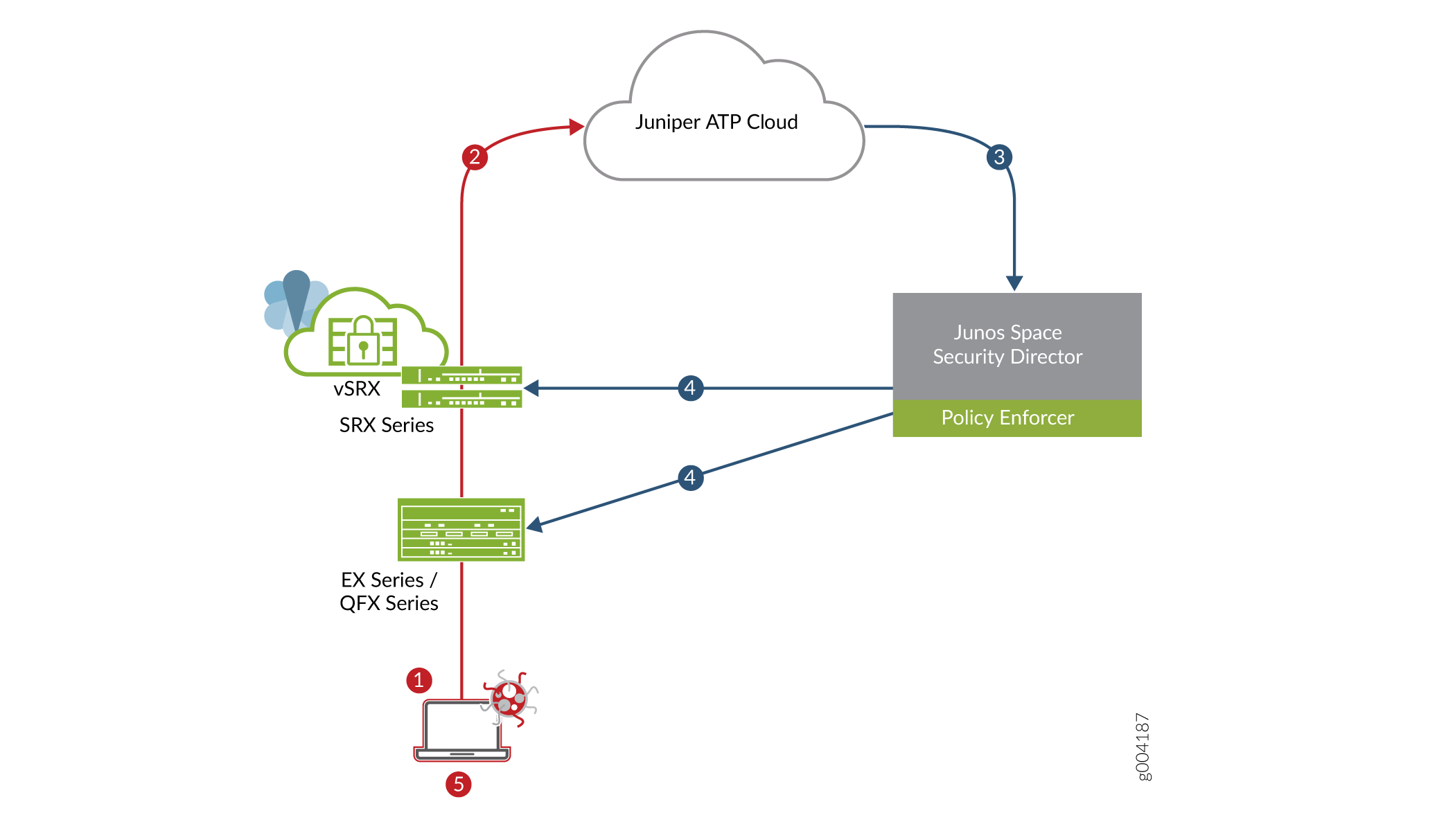 Policy Enforcer communicates the infected host details back to Juniper ATP Cloud. |