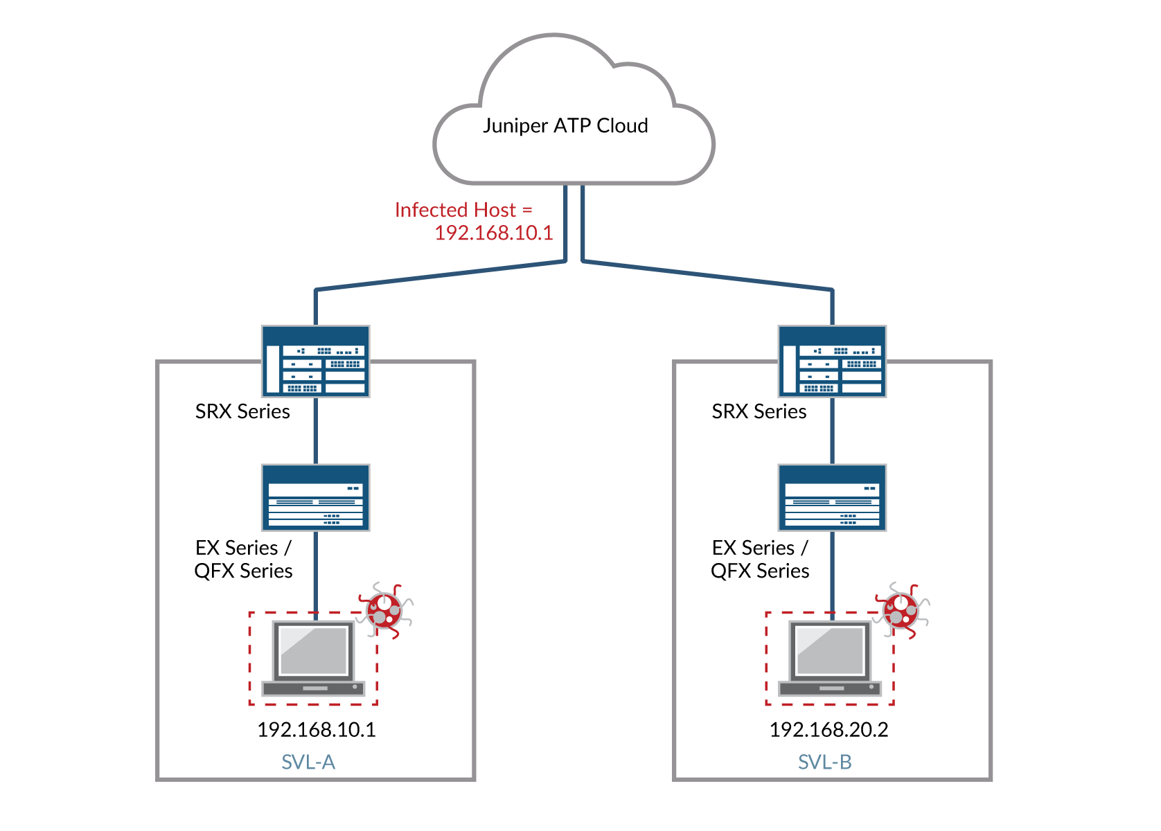 In this example, Juniper ATP Cloud identifies the endpoint as having an IP address of 192.168.10.1 and resides in SVL-A. The EX Series switch quarantines it because it has been labeled as an infected host by Juniper ATP Cloud. Suppose the infected host physically moves from location SVL-A to location SVL-B. The EX Series switch (in SVL-B) microservice tracks the MAC address to the new IP address and automatically quarantines it. Policy Enforcer then informs Juniper ATP Cloud of the new MAC address-to-IP address binding.