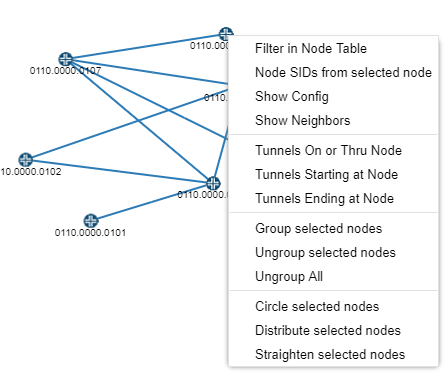 Figure 1: Right-Click Options for Nodes or GroupsNetwork diagram with labeled nodes like 0110.0000.0107 connected by lines. Context menu offers node interactions like filtering and managing groups.