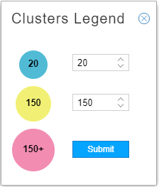 Figure 10: Customizing the Clusters LegendClusters Legend interface with blue circle 20, yellow circle 150, pink circle 150+. Dropdowns for blue and yellow, blue Submit button, close icon top-right.