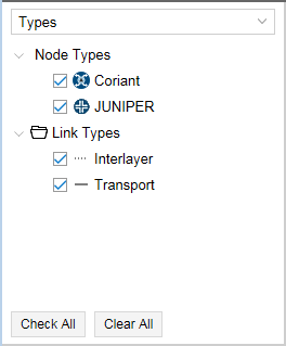 You can select or deselect a type by checking or clearing the check box beside it. Only selected options are displayed in the topology map. Click Check All to select all check boxes; click Clear All to clear all check boxes.