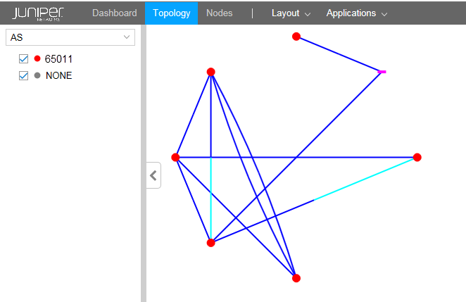 The autonomous systems (AS) list assigns a color, for purposes of representation on the topology map, for each AS number configured in the network. In Figure 9, routers configured with AS 65011 appear on the topology map as red dots. NONE shows the color assigned to routers with no AS configured.