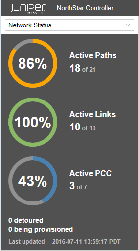 The panel displays the percentage and count of the network’s active paths, active links, and active PCCs that are in an UP state. The display is updated every one to two minutes, depending on the frequency of incoming events. The busier the network, the more frequent the update.