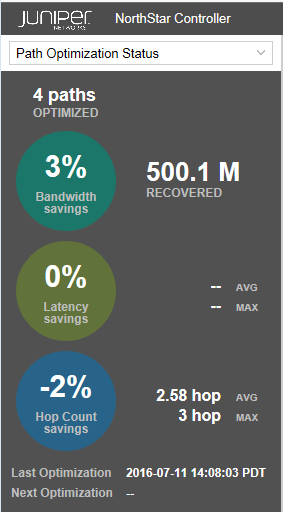 Displays path optimization statistics and information, such as the number of paths that were last optimized, the percent of bandwidth savings achieved, the percent hop count savings, and the time and date of the next optimization if one is scheduled.