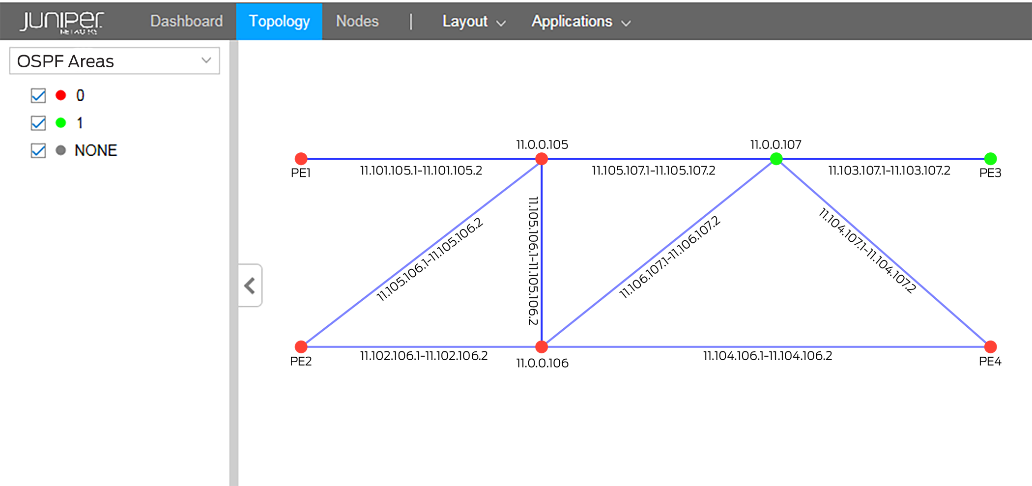 In Figure 11, routers with OSPF area 0 configured appear on the topology map as red dots. Those with OSPF area 1 appear as green dots. NONE shows the color assigned to routers with no OSPF area configured.