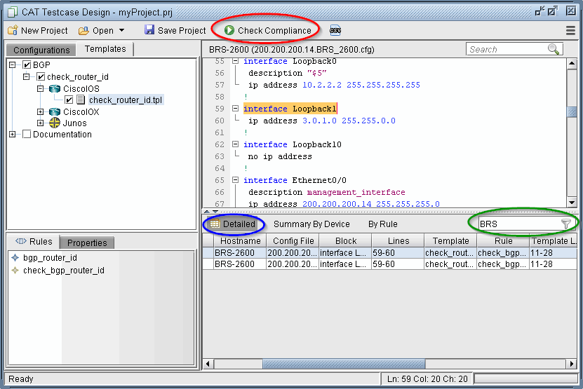 The Detailed tab shows the specific details for each configuration check. Double-clicking an entry will open the configuration file at the matching line. The Summary By Device tab provides statistics for the configuration check per device. The By Rule tab provides statistics for the configuration check per template rule.