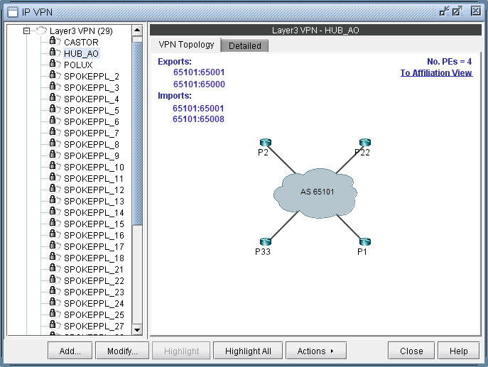 Click on To Import/Export Relation View to get to the Import/Export Relation View. The blue circle icon with a triangle inside is a grouping icon represents the current VPN (HUB_A0), while the yellow dot icons represent other VPNs (in this example, the SPOKEPPL_* VPNs) that have export/import relationships with the current VPN.