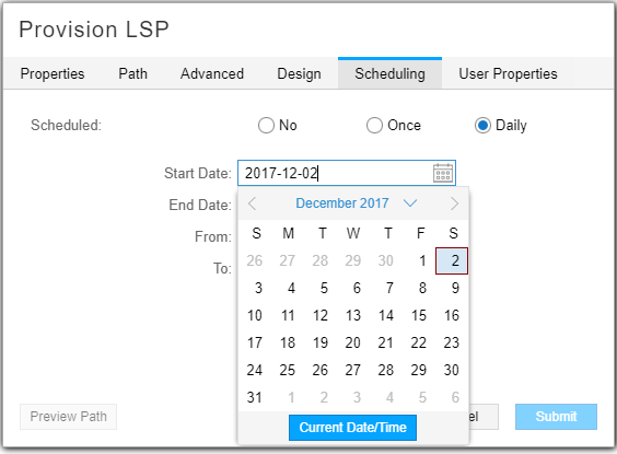 Figure 5: Provision LSP Window, Scheduling TabScheduling interface for Provision LSP task with Daily option, start date set to December 2, 2017. Includes Preview Path, Submit, and Cancel buttons.