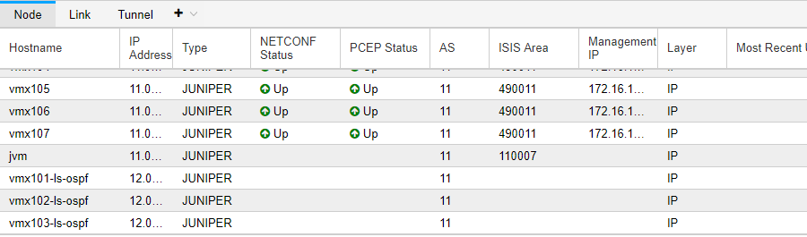 Figure 7: PCEP Status Column Showing Physical and Logical NodesNetwork management interface displaying a Juniper node list with columns: Hostname, IP Address, Type, NETCONF Status, PCEP Status, AS, ISIS Area, Management IP, Layer, Most Recent. All protocols operational.