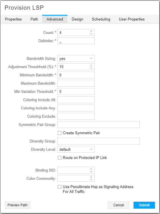 If you are creating multiple parallel LSPs that will share the same Design parameters, the Name you specify here is used as the base for the automatic naming of those LSPs. See the Count and Delimiter fields on the Advanced tab for more information.