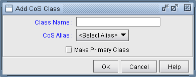 Click on the Add button to add a new class. Enter a class name, select an alias from the CoS Alias drop-down box, and choose whether or not you want it to be a primary class by checking the Make Primary Class box. Then click on the OK button. You may add as many CoS classes as needed.