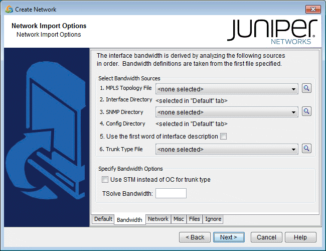 Figure 1: Bandwidth TabNetwork Import Options window from Juniper Networks software for selecting bandwidth sources and specifying options.