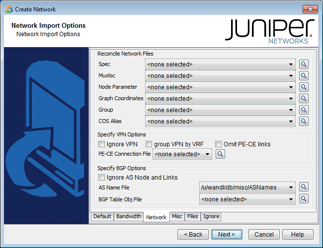 Figure 2: Network TabScreenshot of Juniper Networks Network Import Options window for configuring network data and settings.