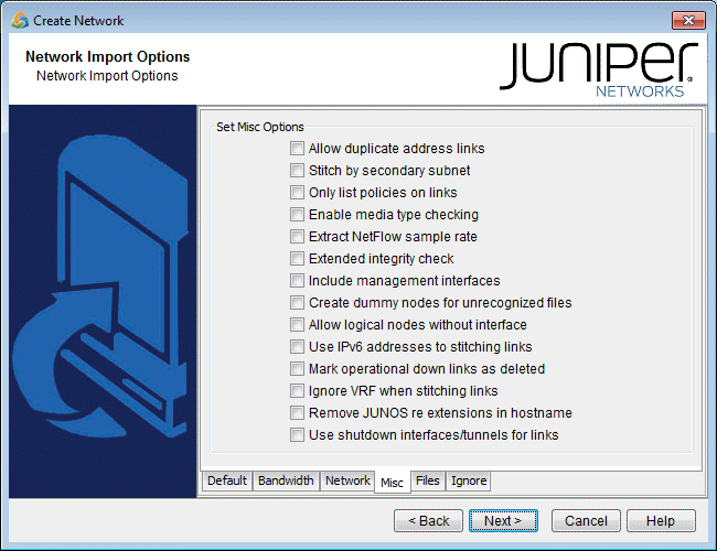 Figure 3: Misc TabJuniper Networks Create Network wizard with Network Import Options. Users can configure import settings like allowing duplicate address links and enabling media type checking using checkboxes. Navigation buttons: Back, Next, Cancel, Help.