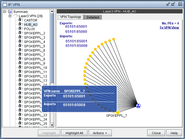 To see how other VPNs (the yellow dots) are related to the current VPN, you can click on a yellow dot to see the route targets that are being exported and imported. For instance the following figure shows that VPN SPOKEPPL_7 is exporting 65101:65001 and importing 65101:65008, while HUB_A0 is exporting 65101:65008 and importing 65101:65001. The Import/Export Relation View allows you to clearly see relationships between VPNs. Note that you can go back to the regular VPN View by clicking on To VPN View.