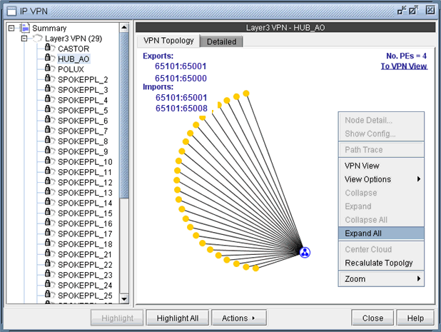The right-click menu of the Import/Export Relation View gives you the option to expand the currently collapsed VPN (HUB_AO) which is represented by the blue circle icon with a triangle in it. Selecting Expand All would reveal all the nodes with in the VPN.