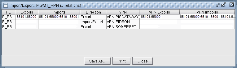 The Report Manager includes a VPN Export-Import report under Network Reports > VPN, as shown in the following figure, that shows all of the route target export/import relationships that exist between VPNs in the network.