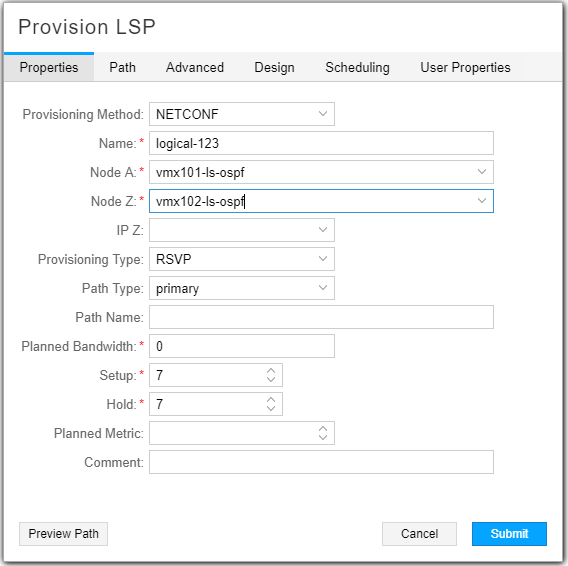 From any tab, you can click Preview Path at the bottom of the window to see the path drawn on the topology map, and click Submit to complete the LSP provisioning. These buttons become available as soon as Name, Node A, and Node Z have been specified.